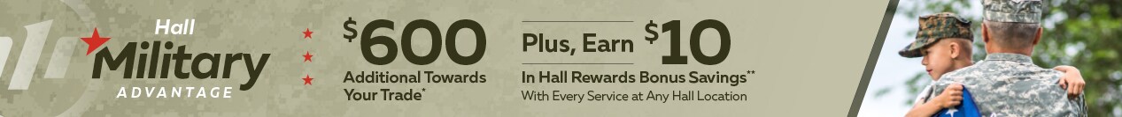 ** Hall Military Offer available to active members, retirees, veterans within 24 months of separation and immediate family members of U.S. military branches who are U.S. residents. Must present United States Military ID. May be combined with some special offers. See Dealer for details.