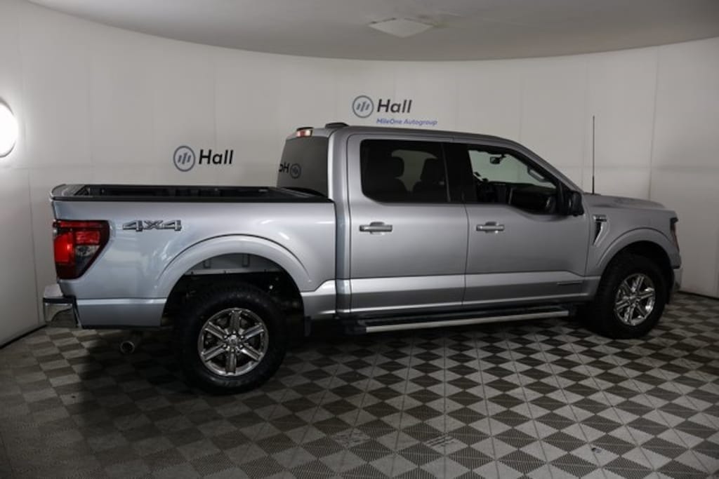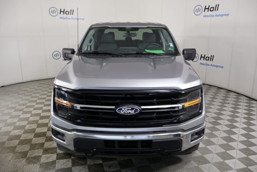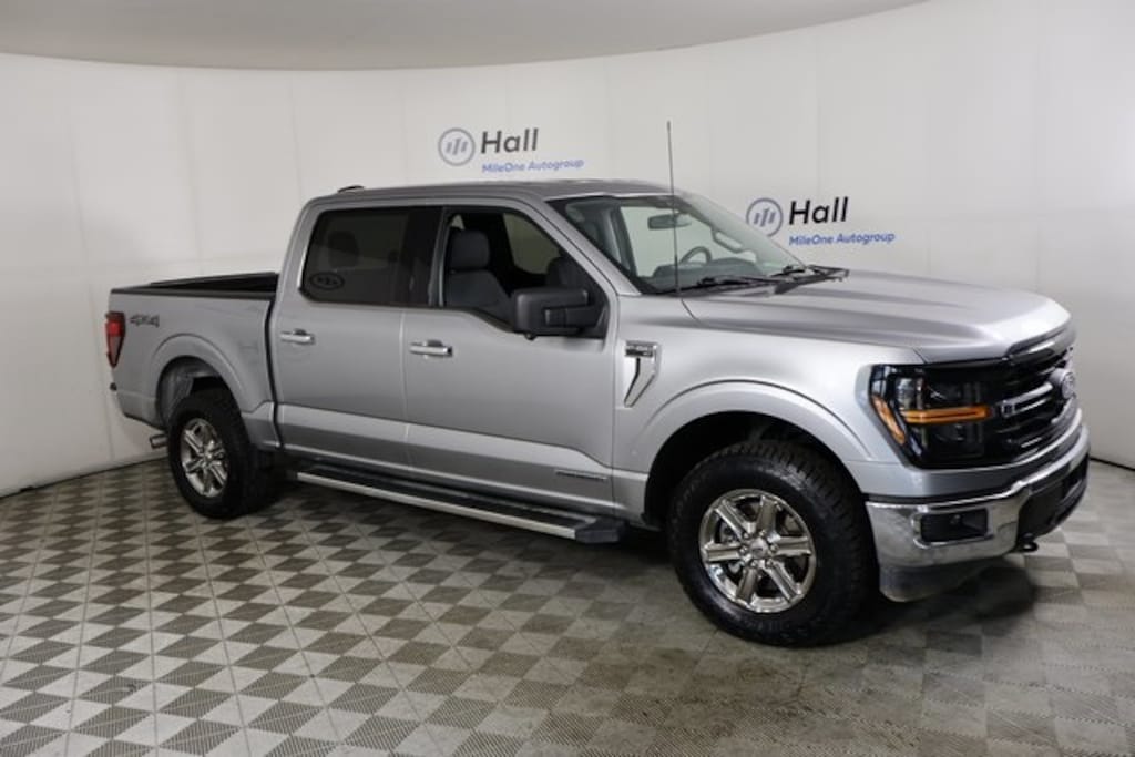 CARFAX One-Owner. Clean CARFAX. Silver Metallic 2024 Ford F-150 XLT 4WD 10-Speed Automatic 3.5L PowerBoost Full-Hybrid V6 We are currently offering Vehicle Purchase Home Delivery by appointment. Please contact for details., 3.5L PowerBoost Full-Hybrid V6, 4WD, 4-Wheel Disc Brakes, 6 Speakers, ABS brakes, Air Conditioning, Alloy wheels, AM/FM radio: SiriusXM with 360L, Auto High-beam Headlights, Auto-dimming Rear-View mirror, Automatic temperature control, Brake assist, Bumpers: chrome, Chrome wheels, Cloth 40/20/40 Front Seat, Cloth 40/Console/40 Front Seats, Compass, Console Worksurface, Delay-off headlights, Driver door bin, Driver vanity mirror, Dual front impact airbags, Dual front side impact airbags, Electronic Stability Control, Emergency communication system: SYNC 4 911 Assist, Equipment Group 301A Standard, Front anti-roll bar, Front Center Armrest w/Storage, Front dual zone A/C, Front fog lights, Front reading lights, Front wheel independent suspension, Fully automatic headlights, Heated door mirrors, Illuminated entry, Low tire pressure warning, Mobile Office Package, Navigation system: Connected Navigation, Occupant sensing airbag, Outside temperature display, Overhead airbag, Overhead console, Panic alarm, Partitioned Lockable Rear Storage, Passenger door bin, Passenger vanity mirror, Power door mirrors, Power driver seat, Power steering, Power windows, Radio data system, Radio: AM/FM SiriusXM w/360L, Rear reading lights, Rear step bumper, Rear window defroster, Remote keyless entry, Security system, Speed control, Split folding rear seat, Steering wheel mounted audio controls, SYNC 4 w/Enhanced Voice Recognition, Tachometer, Telescoping steering wheel, Tilt steering wheel, Traction control, Trip computer, Variably intermittent wipers, Voltmeter, Wheels: 18" Chrome-Like PVD, 3.5L PowerBoost Full-Hybrid V6, 4WD.