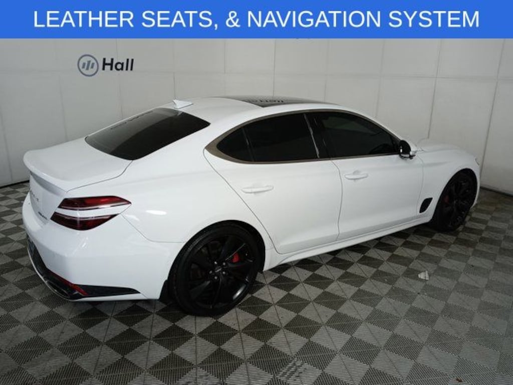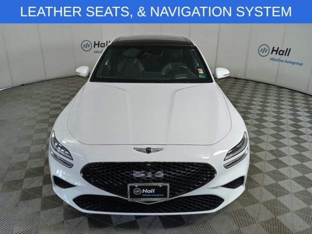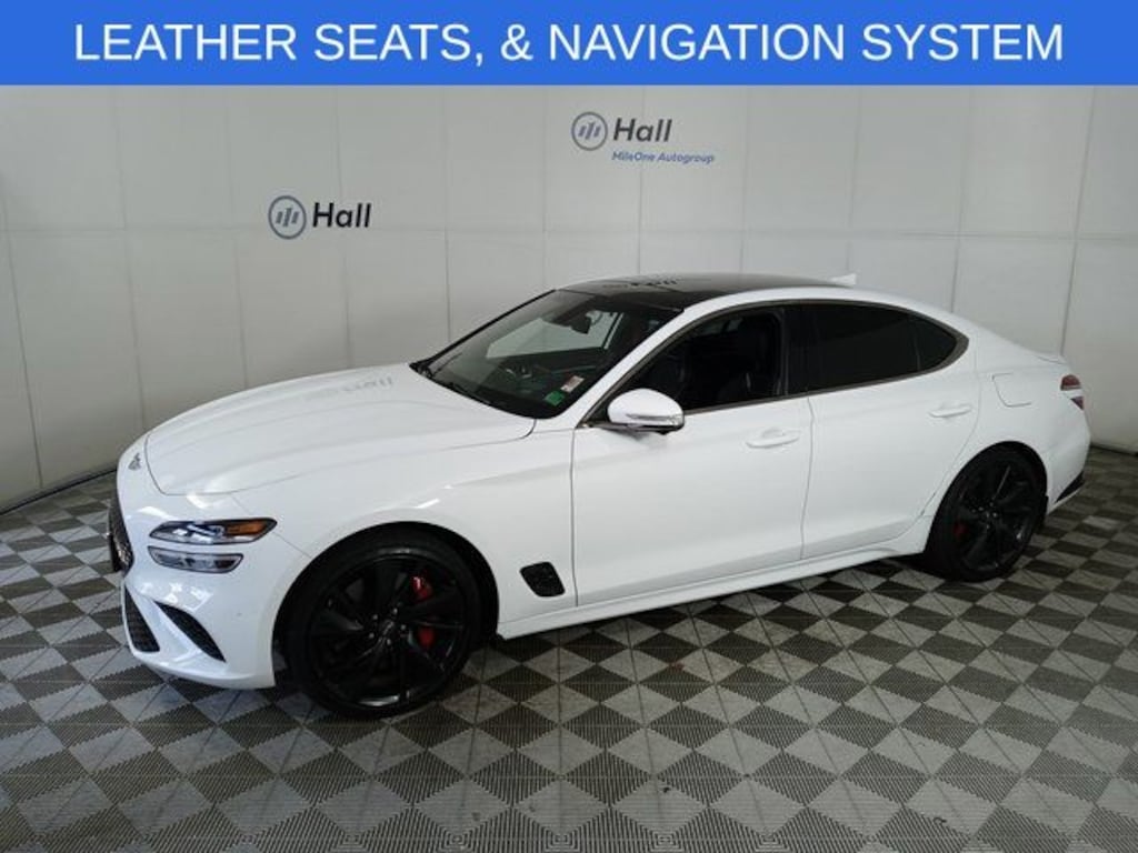 Clean CARFAX. Alta White 2023 Genesis G70 3.3T AWD 8-Speed Automatic with SHIFTRONIC 3.3L V6 DGI DOHC 24V G70 3.3T, 4D Sedan, 3.3L V6 DGI DOHC 24V, 8-Speed Automatic with SHIFTRONIC, AWD, Alta White, Obsidian Black/Red Stitch Leather, We are currently offering Vehicle Purchase Home Delivery by appointment. Please contact for details., Brembo Braking System, Electronically Controlled Suspension, Heads-Up Display (HUD), Limited-Slip Differential, Microfiber Suede Headliner & Pillars, Nappa Leather Seating Surfaces, Navigation System, Option Group 04, Power Trunk, Sport Prestige Package, Surround View Monitor w/Blind Spot View Monitor.